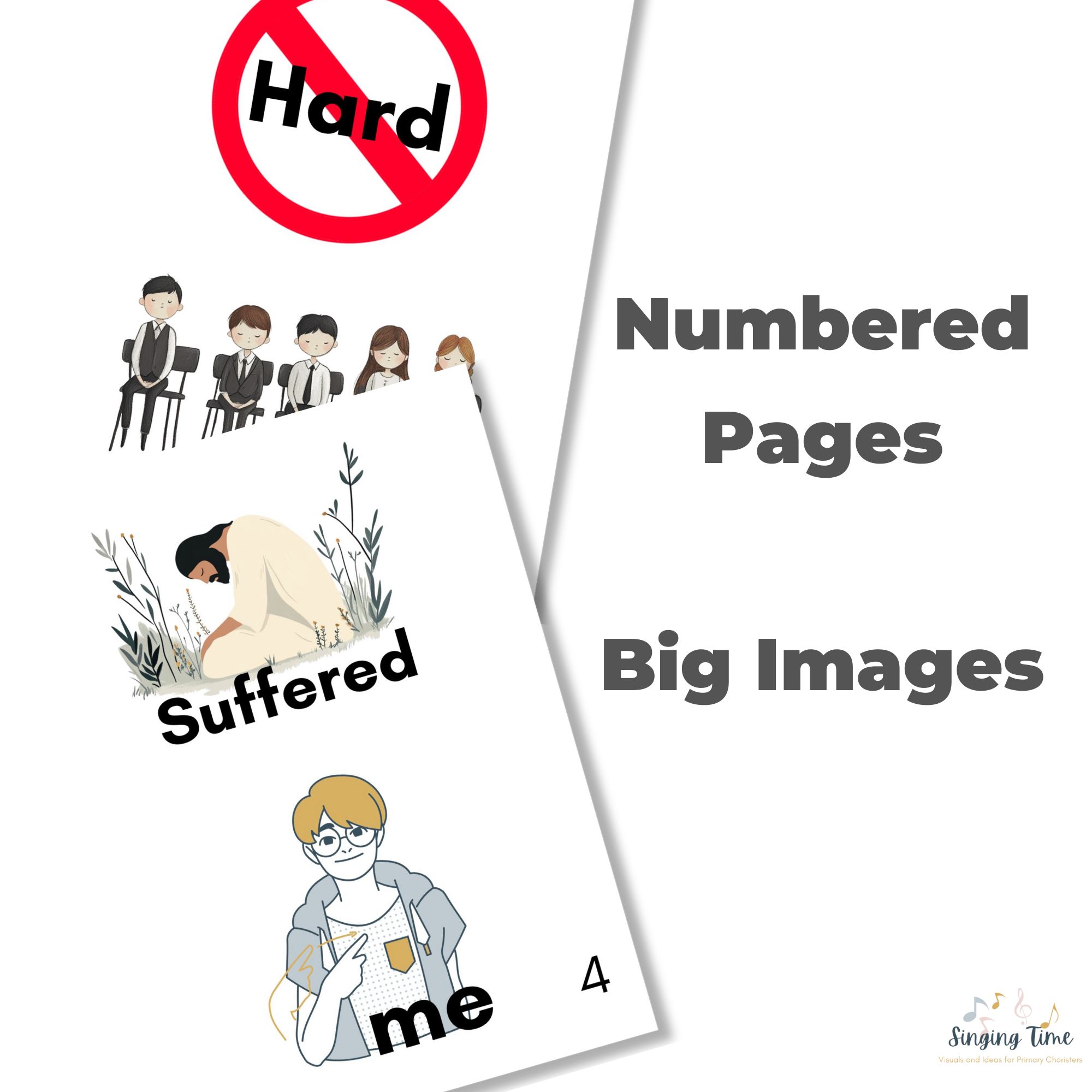 Easy to print 8.5″x11″ (regular computer paper) Visual aids for teaching Primary children the song, “To Think About Jesus”.